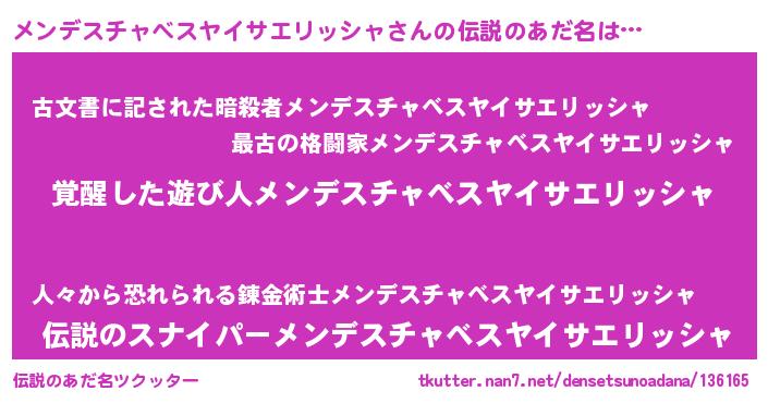 | 男性向けラノベタイトル風あだ名 | 『メンデスチャベスヤイサエリッシャの嫁は女の子じゃないと思った?』 |