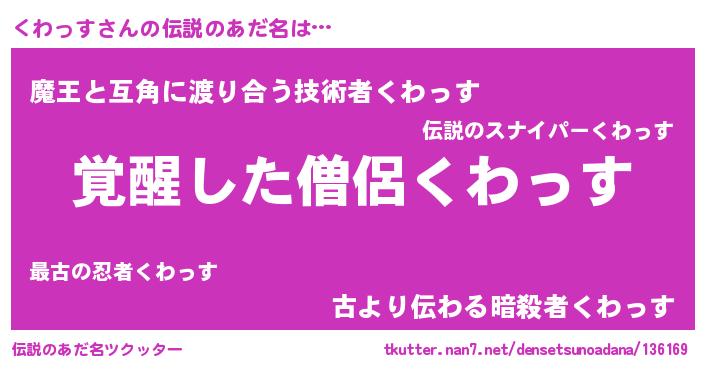 | 男性向けラノベタイトル風あだ名 | 『くわっすの嫁は女の子じゃないと思った?』 |