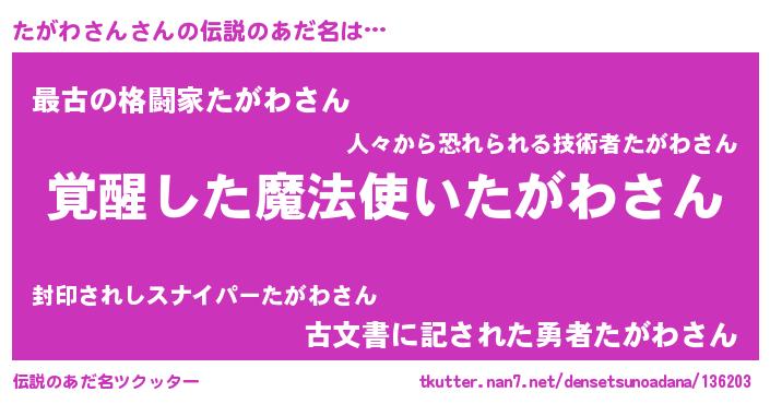 | 男性向けラノベタイトル風あだ名 | 『たがわさんの嫁は女の子じゃないと思った?』 |
