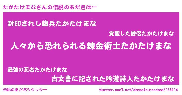 | 男性向けラノベタイトル風あだ名 | 『タカタケマナスレイヤー』 |