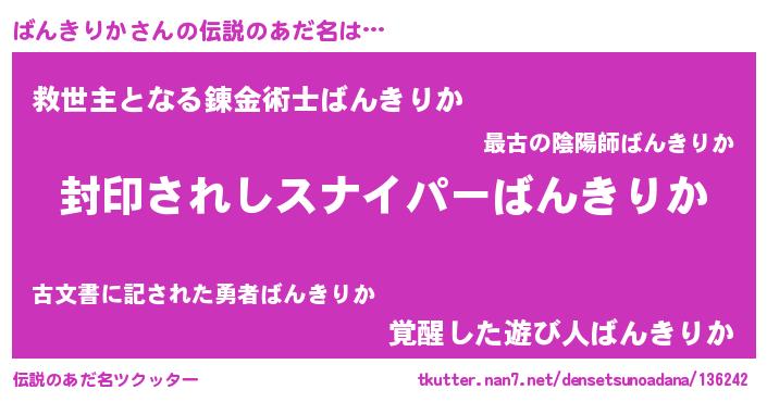 | 意味不明あだ名 | 『ニラ科ばんきりか属』『自称ばんきりか』 |