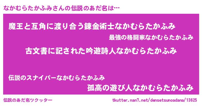 | 意味不明あだ名 | 『住所不定無職なかむらたかふみ(6歳)』 |