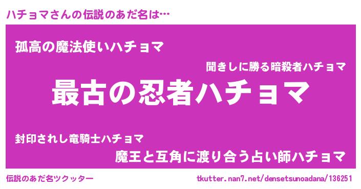 | ヒーロー風カッコイイあだ名 | 『ウルトラハチョママン』『幻影騎士ハチ』 |