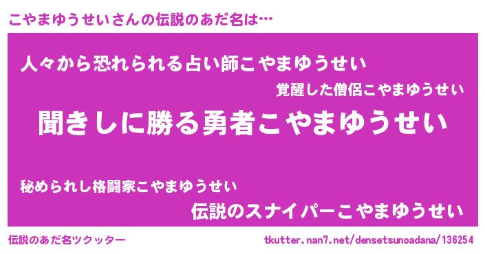 | ヘコむあだ名 | 『こやまゆうせい(苦笑)』『こやにゅー』 |
