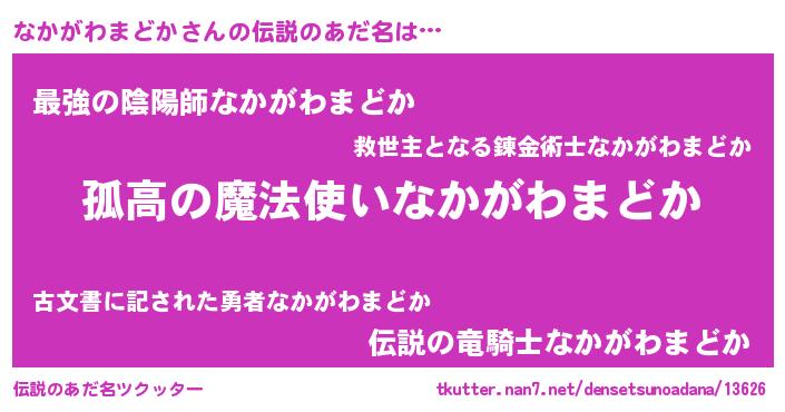 | 胡散臭い通販商品みたいなあだ名 | 『信頼と実績のサプリメント…その名も「なかがわまどか」』 |