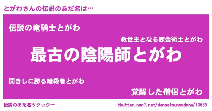| ファンタジー風あだ名 | 『エターナルトガワー』『トガフェル』 |