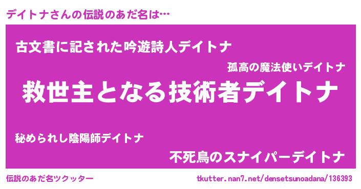 | 女子向けラノベタイトル風あだ名 | 『死神デイトナの再婚』 |