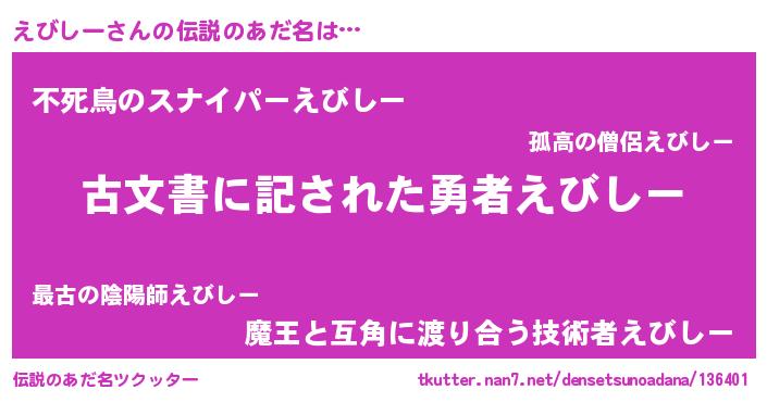 | 男性向けラノベタイトル風あだ名 | 『えびしーに滅ぼされるだけの簡単なお仕事です』 |