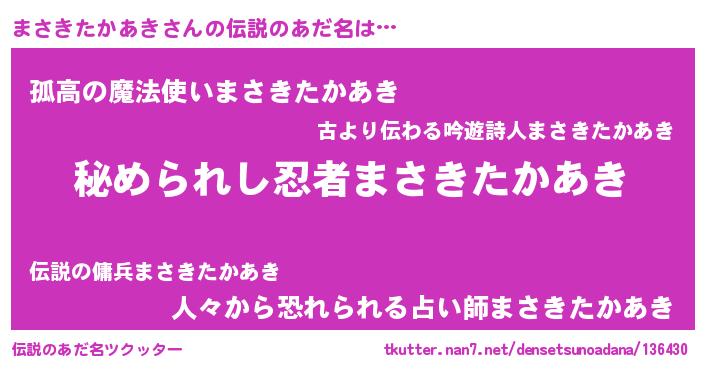 | 男性向けラノベタイトル風あだ名 | 『やはりまさきたかあきの青春ラブコメはまちがっている 』 |