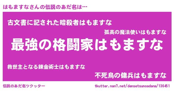 | ヒーロー風カッコイイあだ名 | 『最強戦士ハモマスナ』『ネオハモマスナ』 |