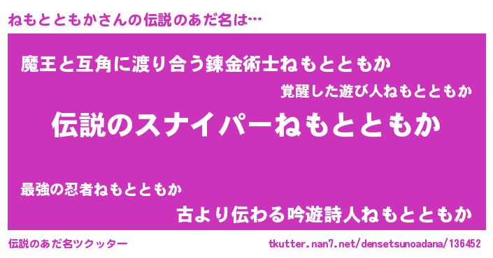 | 胡散臭い通販商品みたいなあだ名 | 『必ず成功する霊験あらたかなお札…その名も「ねもとともか」』 |