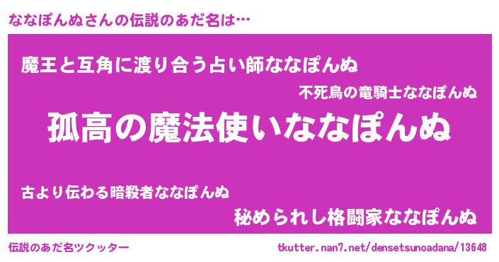 | 男性向けラノベタイトル風あだ名 | 『ダンジョンにななぽんぬを求めるのは間違っているだろうか』 |