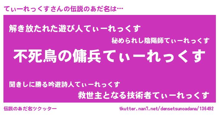 | 男性向けラノベタイトル風あだ名 | 『てぃーれっくすの憂鬱』 |
