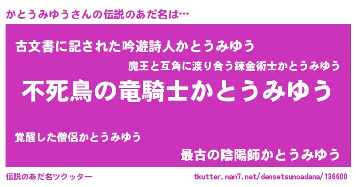 | 女子向けラノベタイトル風あだ名 | 『かとうみゆう姫と円卓の騎士』 |
