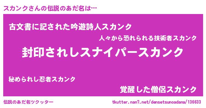 | 男性向けラノベタイトル風あだ名 | 『Re:スカンクから始める異世界生活』 |