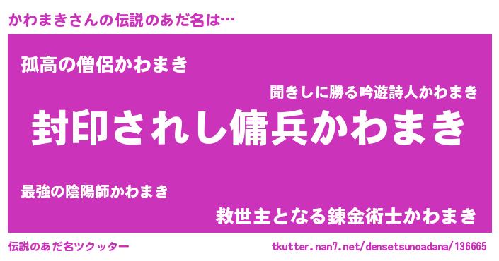 | 男性向けラノベタイトル風あだ名 | 『Re:かわまきから始める異世界生活』 |