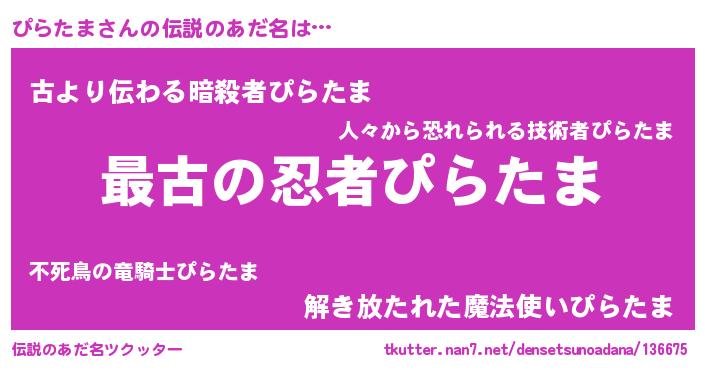 | 男性向けラノベタイトル風あだ名 | 『この素晴らしい世界にぴらたまを!』 |