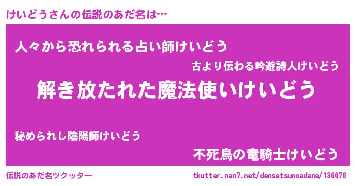 | ヒーロー風カッコイイあだ名 | 『魔戒騎士ケイ』『愛の使者けいどう』 |