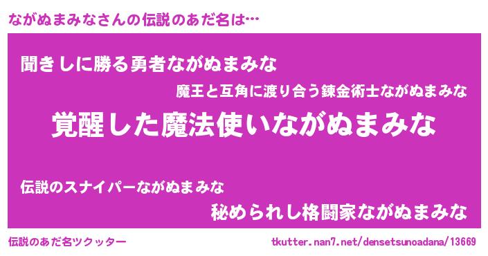 | 意味不明あだ名 | 『住所不定無職ながぬまみな(13歳)』 |