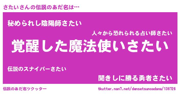 | 意味不明あだ名 | 『住所不定無職さたい(7歳)』『自称さたい』 |