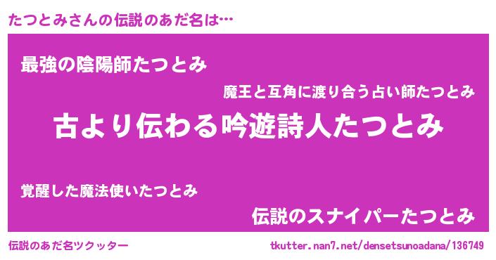 | ヒーロー風カッコイイあだ名 | 『ネオタツトミ』『ウルトラたつとみマン』 |