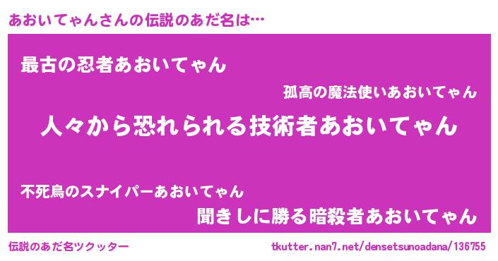 | ヒーロー風カッコイイあだ名 | 『仮面アオダー』『最強戦士アオイテャン』 |