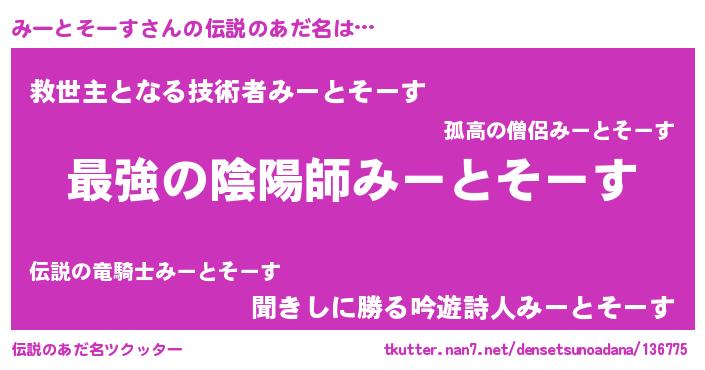 | 肩書あだ名 | 『みーとそーす総統』『みーとそーす教官』 |