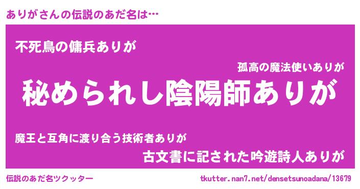 | 男性向けラノベタイトル風あだ名 | 『アリガスレイヤー』『ありがの憂鬱』 |