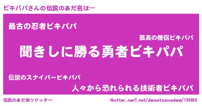 | 意味不明あだ名 | 『住所不定無職ビキパパ(89歳)』 |