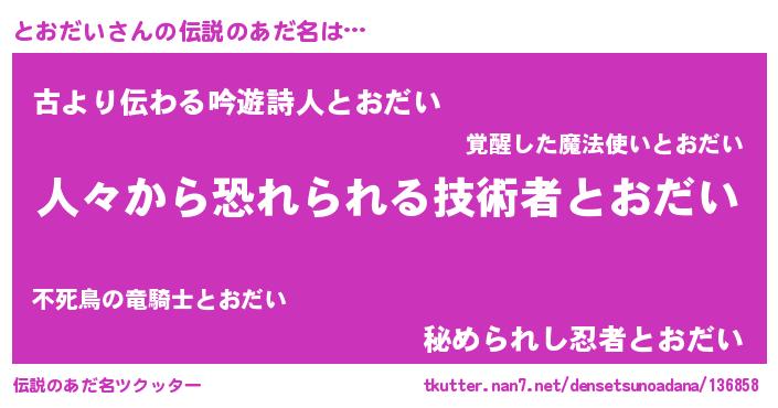 | ヒーロー風カッコイイあだ名 | 『正義の使者とおだい』『ネオトオダイ』 |