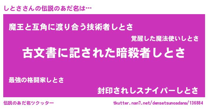 | ヒーロー風カッコイイあだ名 | 『ネオシトサ』『慈愛の使者しとさ』 |