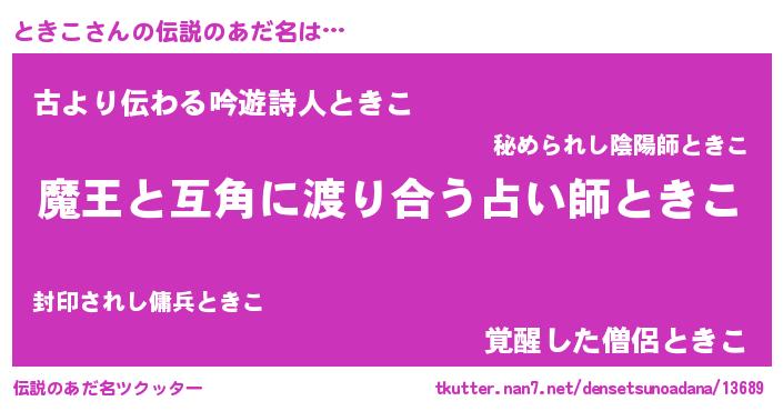 | 女子向けラノベタイトル風あだ名 | 『ときこ恋絵巻』『ときこの契約王妃』 |