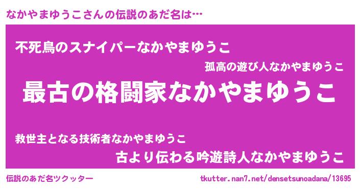 | 男性向けラノベタイトル風あだ名 | 『魔弾の王となかやまゆうこ』 |