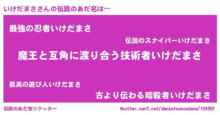 | 男性向けラノベタイトル風あだ名 | 『おまえをオタクにしてやるから、俺をいけだまさにしてくれ! 』 |