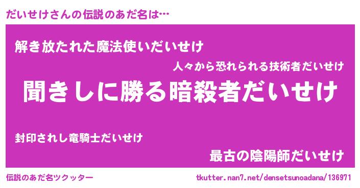| 男性向けラノベタイトル風あだ名 | 『魔弾の王とだいせけ』 |