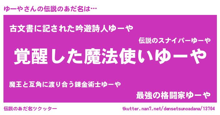 | 男性向けラノベタイトル風あだ名 | 『この素晴らしい世界にゆーやを!』 |