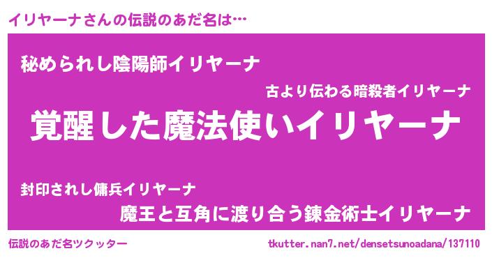 | 男性向けラノベタイトル風あだ名 | 『Re:イリヤーナから始める異世界生活』 |