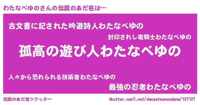 | 男性向けラノベタイトル風あだ名 | 『ダンジョンにわたなべゆのを求めるのは間違っているだろうか』 |