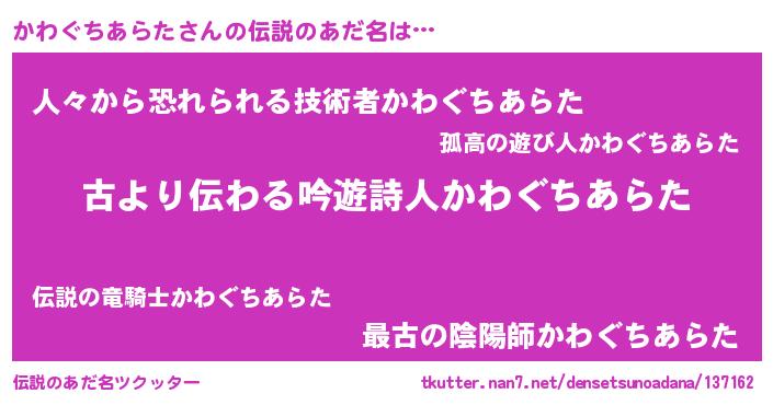 | 男性向けラノベタイトル風あだ名 | 『この素晴らしい世界にかわぐちあらたを!』 |