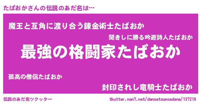 | ヒーロー風カッコイイあだ名 | 『仮面タバダー』『ウルトラたばおかマン』 |