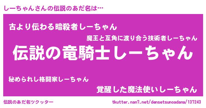| ヒーロー風カッコイイあだ名 | 『スーパーシーチャン』『ネオシーチャン』 |