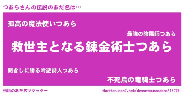 | ヒーロー風カッコイイあだ名 | 『天空の使者つあら』『黄金騎士ツア』 |