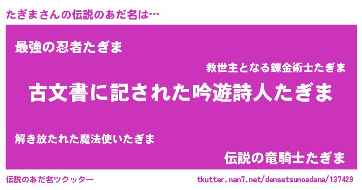 | 意味不明あだ名 | 『自称たぎま』『住所不定無職たぎま(65歳)』 |