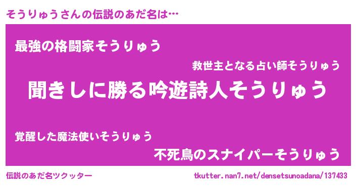 | 意味不明あだ名 | 『自称そうりゅう』『永久保存そうりゅう』 |