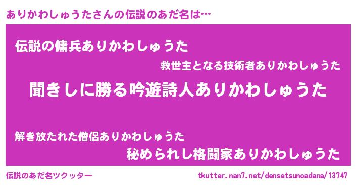 | ヘコむあだ名 | 『ありかわしゅうた(小並感)』『ありにゅー』 |