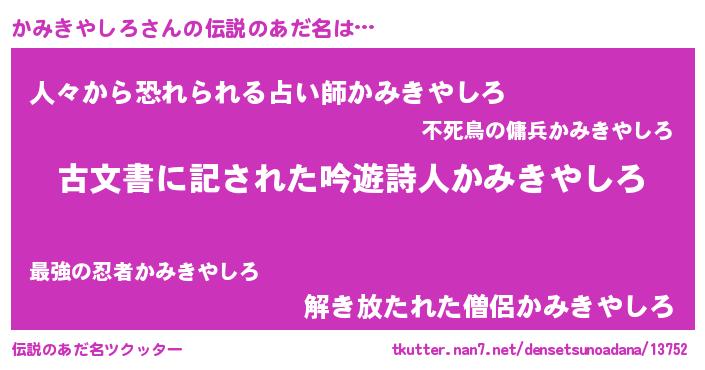 | 意味不明あだ名 | 『住所不定無職かみきやしろ(4歳)』 |