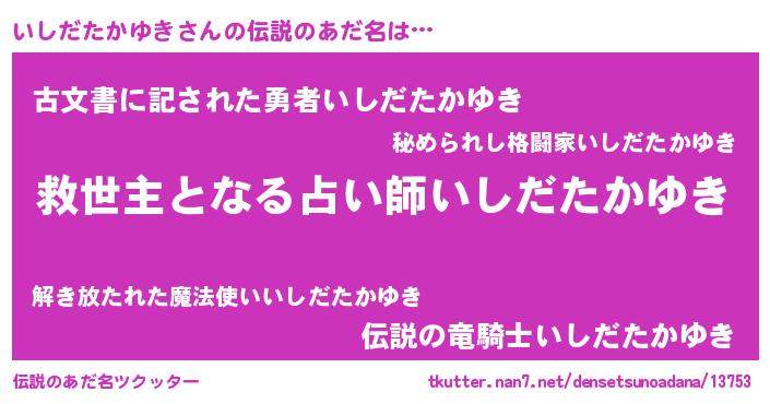 | 男性向けラノベタイトル風あだ名 | 『いしだたかゆきに滅ぼされるだけの簡単なお仕事です』 |