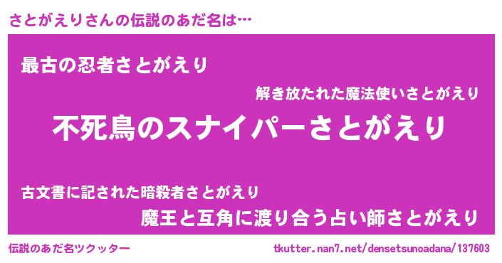 | ヒーロー風カッコイイあだ名 | 『最強戦士サトガエリ』『幻影騎士サト』 |