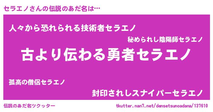 | ヒーロー風カッコイイあだ名 | 『ネオセラエノ』『正義の使者セラエノ』 |