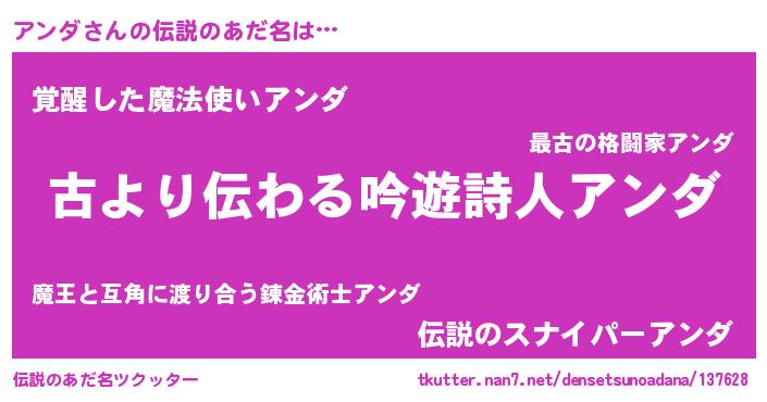 | ヒーロー風カッコイイあだ名 | 『ネオアンダ』『炎刃騎士アン』 |